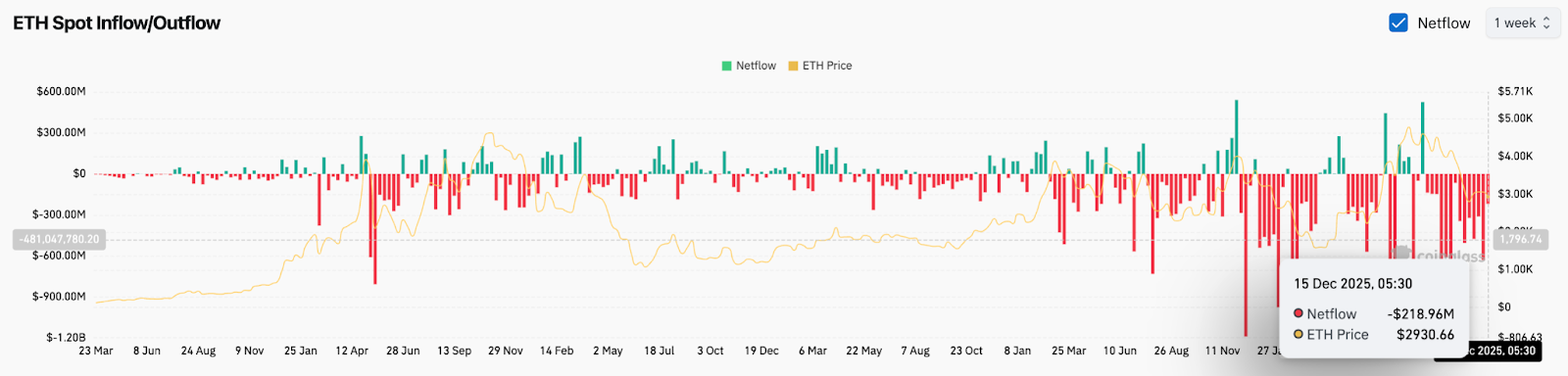 12 月 15 日开始的一周数据显示,ETF 资金持续流出,3 天内流出约 2.2 亿美元,延续了自 9 月以来的趋势。